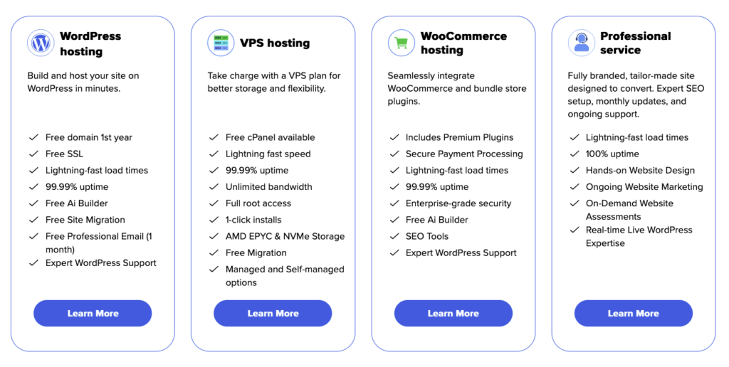Bluehost – Another excellent web hosting provider. I’ve used them before and they also come with in built WordPress. They have different services you can choose from. I’d say go with WordPress hosting to keep things simple